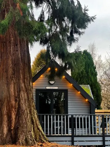 Chalé que aceita animais de estimação com banheira de hidromassagem, proporcionando uma estadia relaxante para hóspedes e seus animais. Localizado em Huntingtower Lodges.